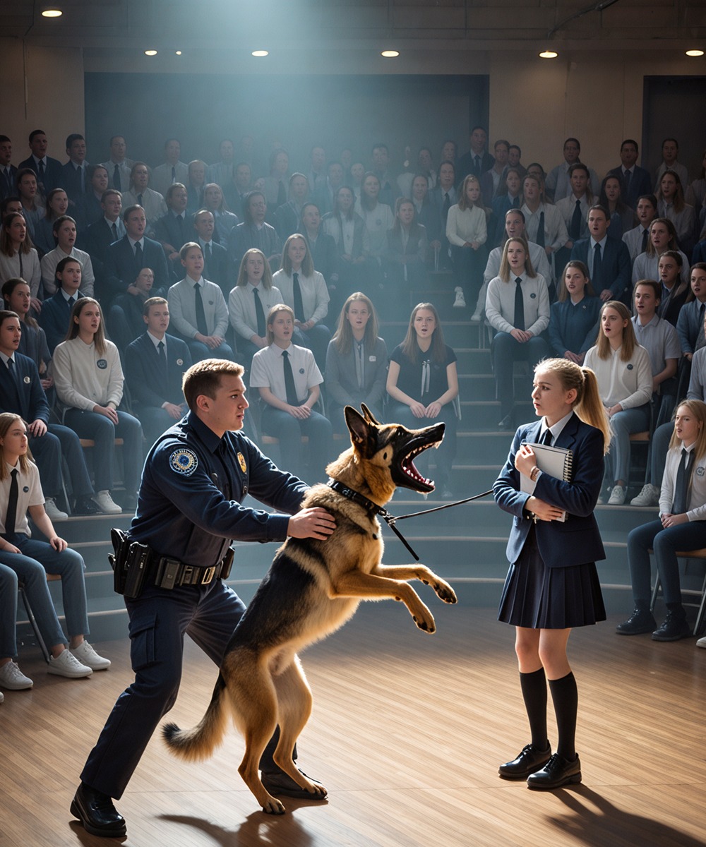Op City High School nr. 17 werd een « open les » over veiligheid georganiseerd. Leerlingen, leraren en ouders verzamelden zich in de grote aula, nieuwsgierig naar wat er ging gebeuren. Een politieagent betrad het podium in vol ornaat, met zijn partner – een Duitse herder genaamd Rex – kalm naast zich.