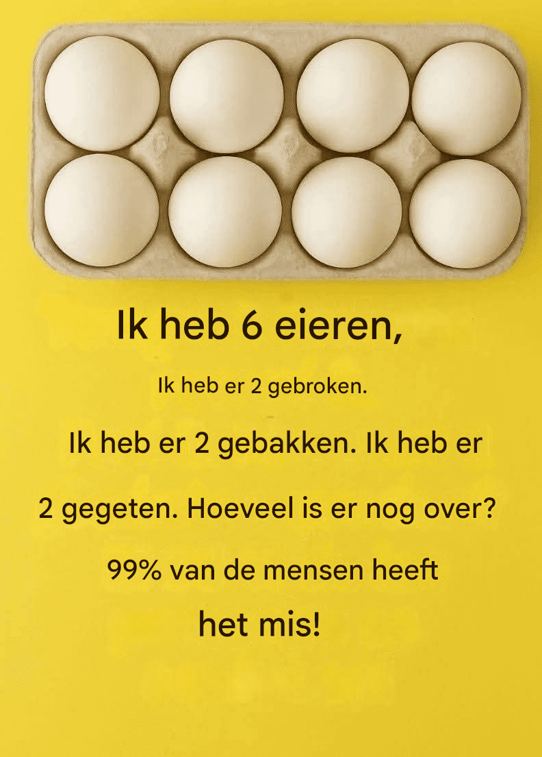 🤯 En inderdaad! De meeste gebruikers antwoorden fout zonder na te denken. Sommigen zeggen dat er 0 eieren over zijn, anderen 4, weer anderen 2… maar wat is het juiste antwoord?