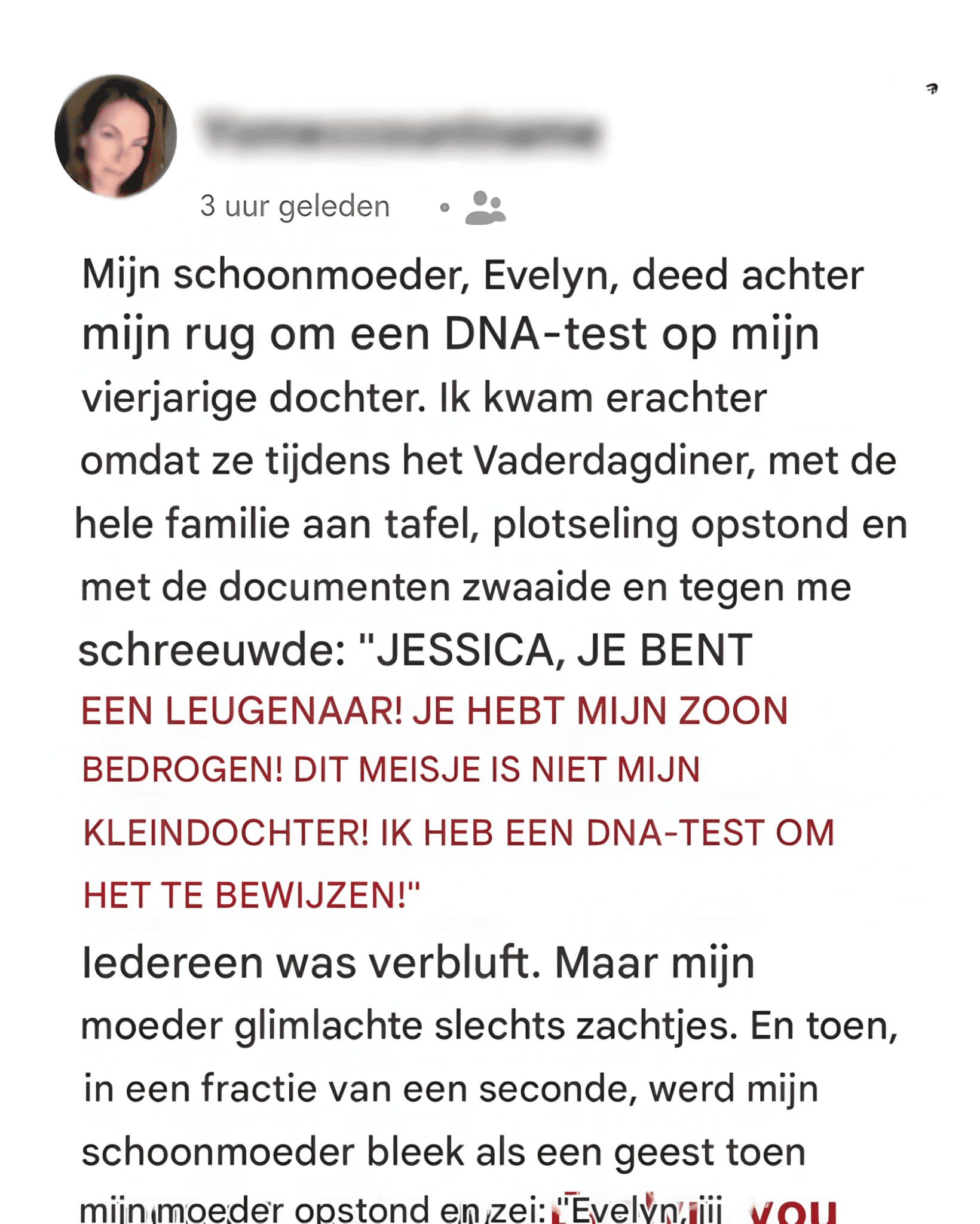 Toen Jessica ermee instemde om een Vaderdagdiner te organiseren met beide kanten van de familie, hoopte ze dat het een gevoel van vrede zou brengen – misschien zelfs een nieuw begin. Maar die hoop werd verbrijzeld toen haar schoonmoeder, Evelyn, in woede uitbarstte.