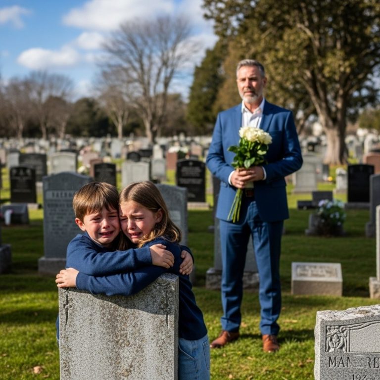 Hij liep tussen rijen grafstenen, verdwaald in gedachten, totdat hij twee kleine figuren zag knielen bij een graf in de verte. Zijn stappen vertraagden. Toen hij dichterbij kwam, raakte zijn adem in zijn keel—het waren zijn tweelingkinderen, Lily en Liam.